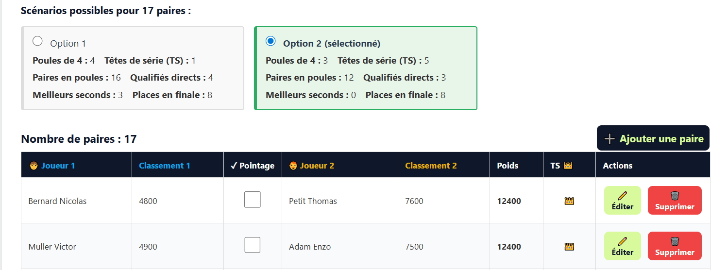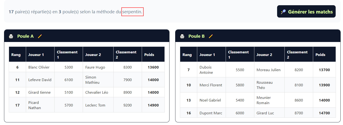 Grâce à un moteur d’appariement intelligent, la plateforme génère automatiquement les rencontres selon le nombre de paires. L’organisateur crée son tournoi en quelques clics, définit le nombre d’équipes, les niveaux de jeu, le nombre de terrains disponibles et la durée des matchs, puis le logiciel se charge de produire un planning optimisé et équilibré.